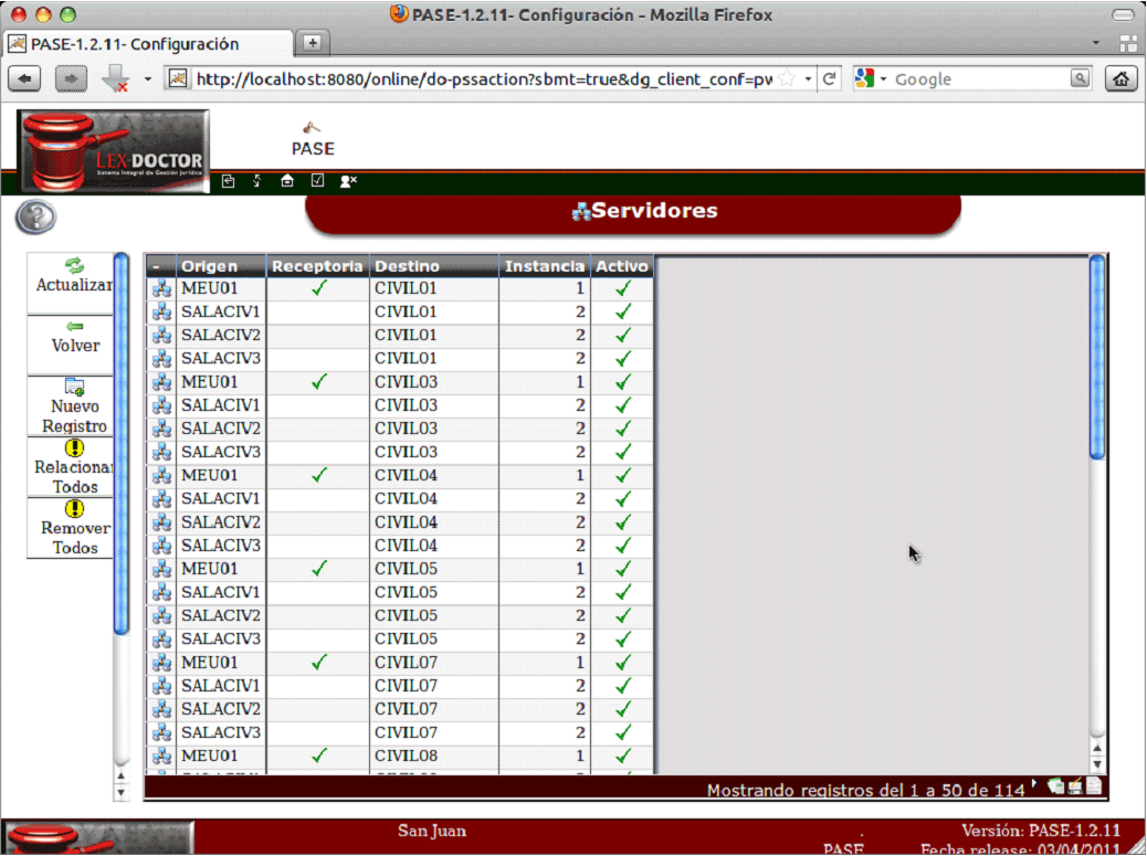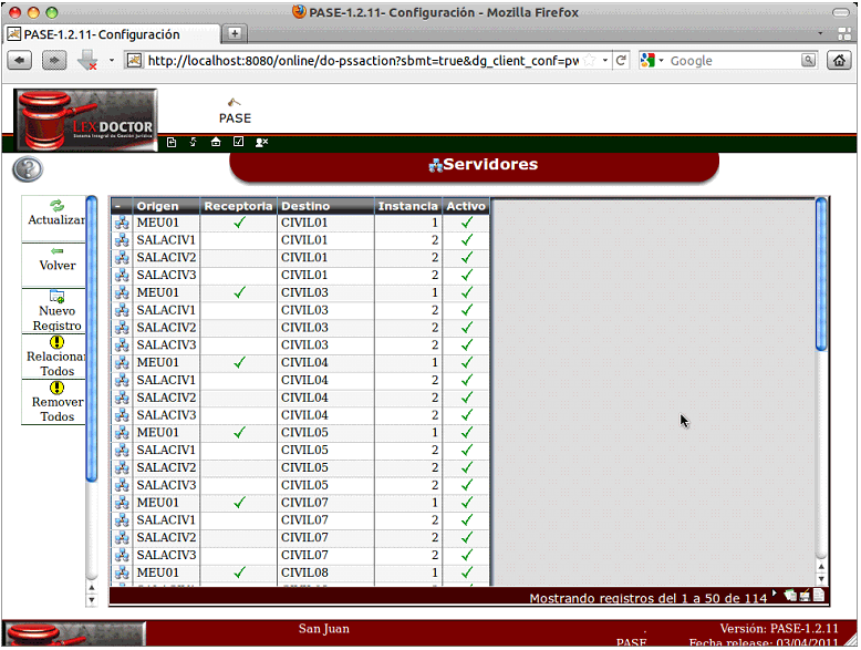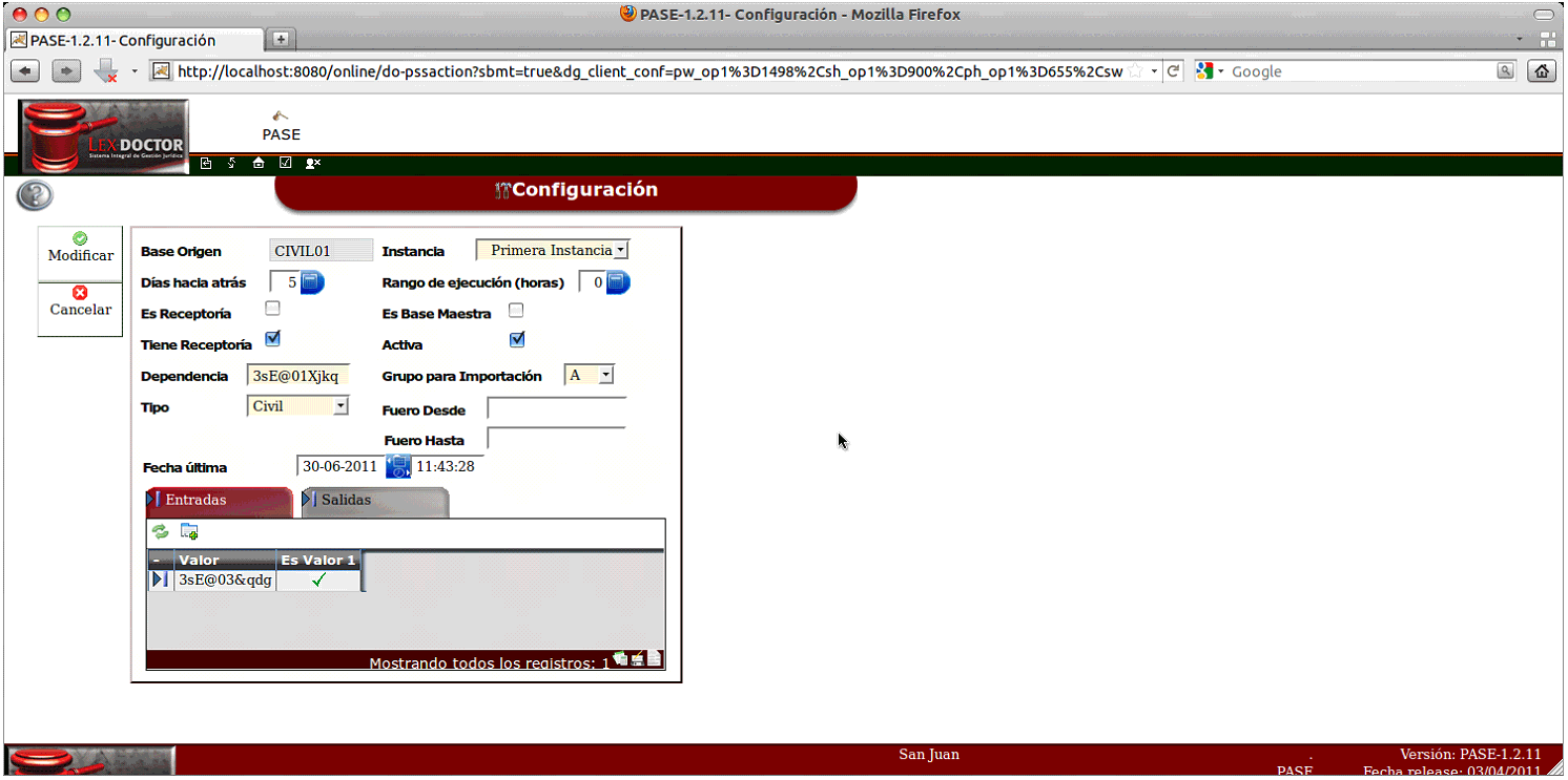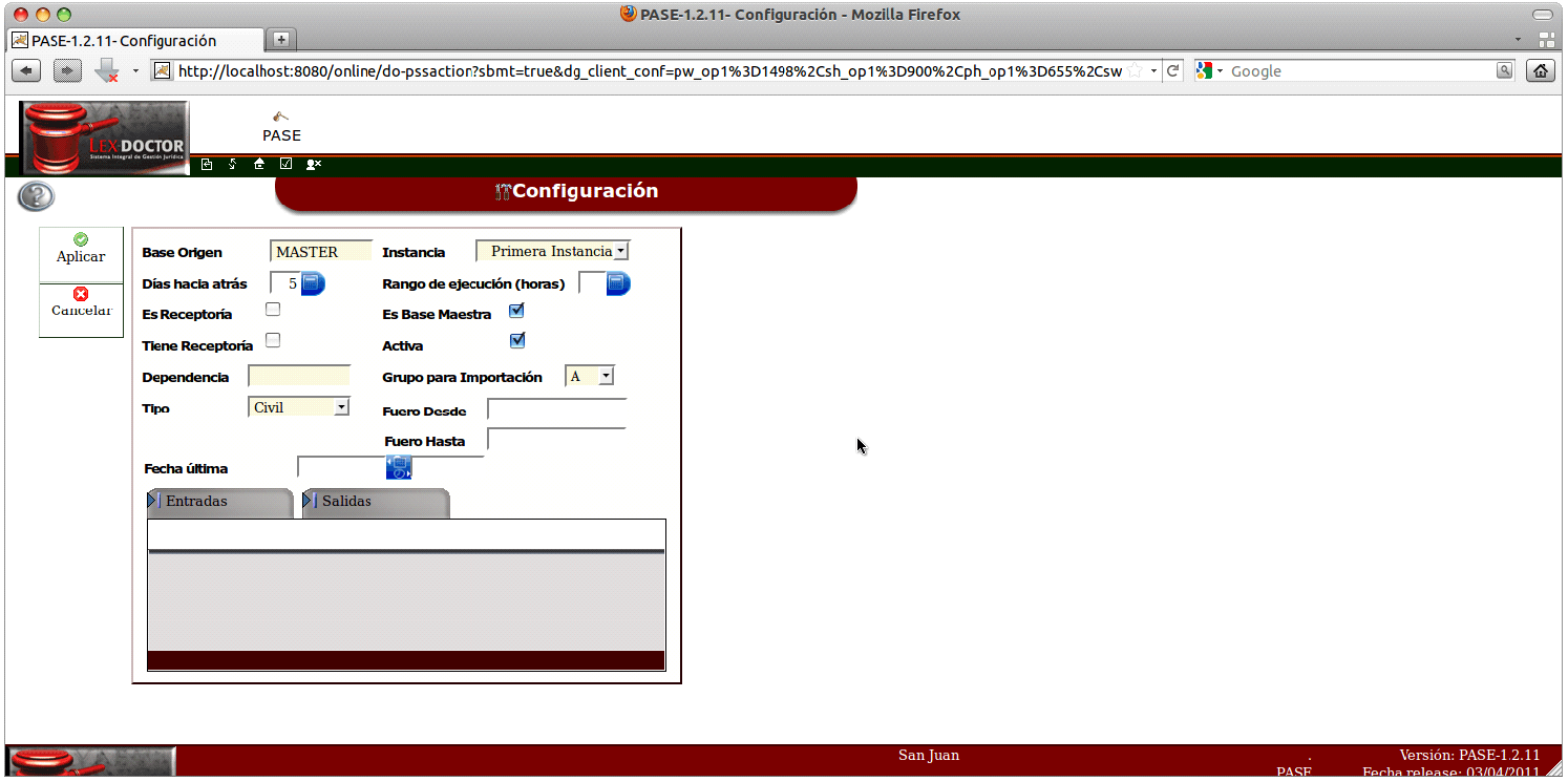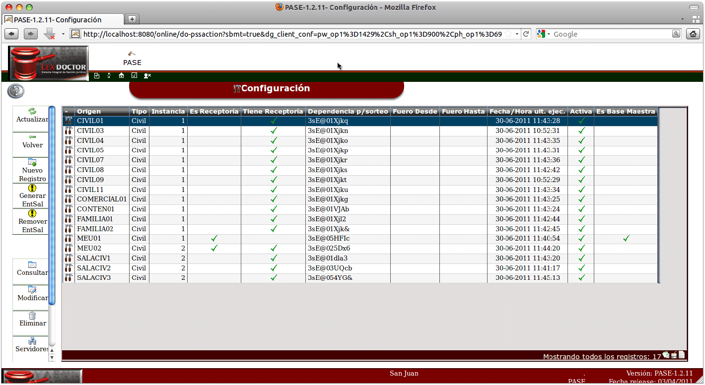 En la opción del menú “Configuración” se definen los datos de los juzgados que van a participar del pase.