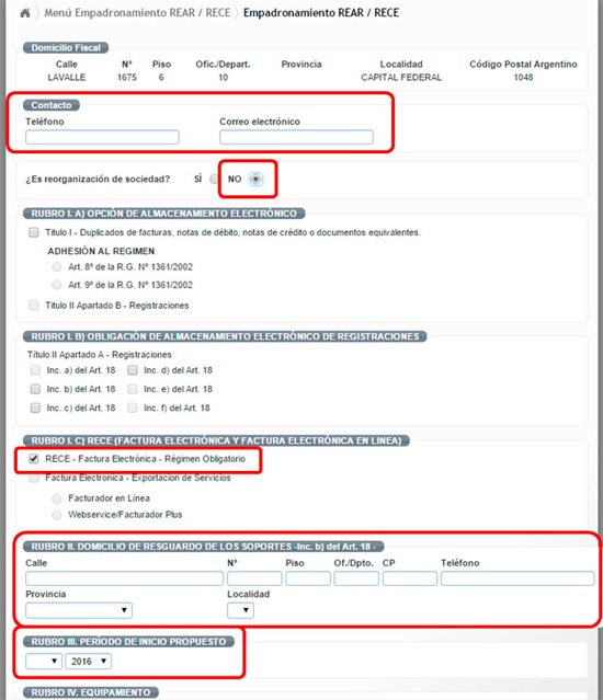 Rubro I apartado "C" marcar "RECE" Factura electrónica – Régimen obligatorio.