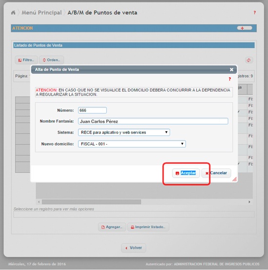 - Completar los datos (recordando especialmente lo puesto en Número ya que será un parámetro que le pedirá Lex al momento de facturar) y luego presionar el botón Aceptar: